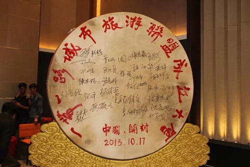 隨著第一屆聯盟主席、開封市人民政府市長侯紅宣布“一帶一路城市旅遊聯盟成立!”,聯盟發起城市代表依次在象征團圓、團結、聯合、合作的直徑為2米的大鼓上簽字,以槌擊鼓,聲震中天,寓意聯盟成員城市借助“一帶一路”這一重要紐帶,共同奏響合作強音,共同譜寫絲路華章。