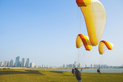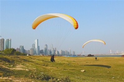 10月20日,秋風習習,南昌市幾名滑翔玩家在贛江邊的草坪上進行滑翔傘訓練。只見他們騰空躍起,體驗空中漫步的曼妙感覺。目前,滑翔傘這項極限運動在南昌已受到不少年輕人的追捧。