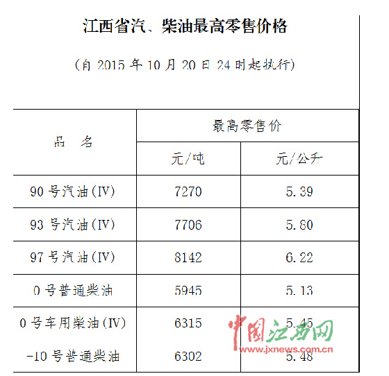 據了解,江西90號汽油將調整為5.39元/公升、93號汽油調整為5.8元/公升、97號汽油調整為6.22元/公升、0號柴油調整為5.13元/公升。