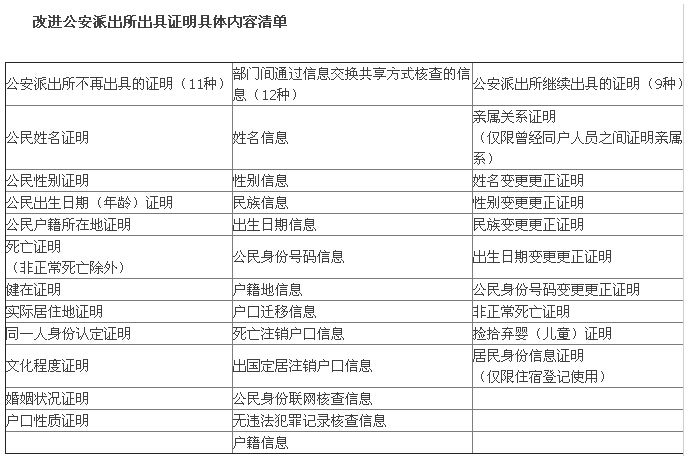 《通知》明確能夠憑居民戶口簿、居民身份證證明的信息以及不屬于公安派出所職責范圍內掌握的信息,公安派出所不再出具證明、部門間可以交換共享的信息不再讓群眾開具證明、特殊情況解決辦法等事項。