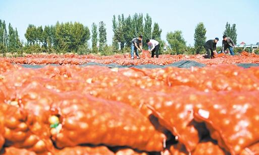 金秋時節,高臺縣駱駝城鎮前進村農民將收獲的洋蔥打包外運。今年,該縣3.1萬畝洋蔥喜獲豐收,預計產值達2億元。本報通訊員 張淵