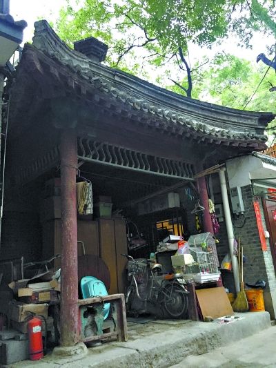 和假山、游廊相對的,是一座保存完好的四角方亭,亭柱表面的紅漆已經斑駁、褪色。這座方亭正好夾在兩座平房之間,亭子里堆放著自行車、塑料盆、鳥籠等物品,顯然已被居民當成儲物間使用。