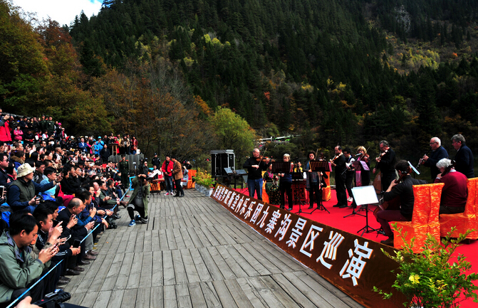 深秋的九寨溝寒意漸濃,但絲毫沒有擋住音樂家們為來自各地的游客獻上精彩演出的的欲望。大家先后演奏了《維瓦爾第小提琴協奏曲》、《托熱利小號協奏曲》、《巴赫小提琴協奏曲》、《莫扎特賦格曲弦樂》、《柴可夫斯基的哀歌弦樂》、《皮亞佐拉小號與弦樂協奏曲》等世界名曲,并眾人合奏了一曲《神奇的九寨》,將自然、交響樂和民族原生態融為一體。整場演出的氣質既摩登又優雅,鮮明地詮釋了東西文化在童話九寨的深度交融,讓現場觀眾和游客在聆聽九寨山水的同時,欣賞中西方文化的碰撞交流,為觀眾帶來了超強的藝術享受和視覺震撼。