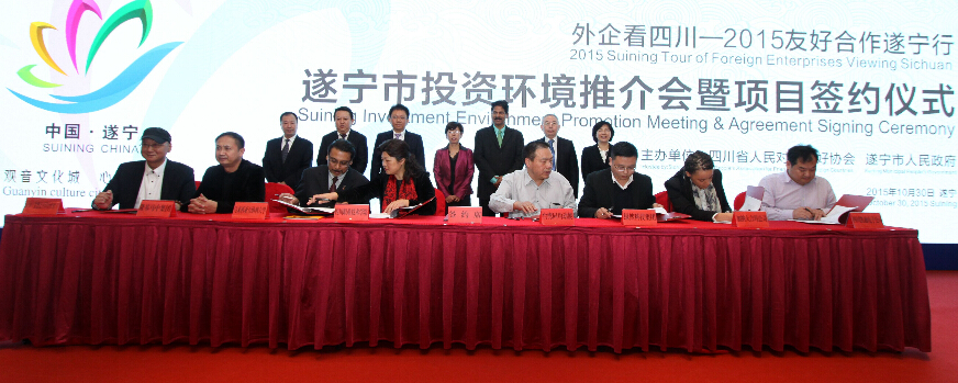 【香港商报网讯】记者金山报道:为加快搭建四川遂宁与国外商务机构和知名企业之间更广阔的交往合作平台,推动遂宁全方位对外开放合作,提升遂宁美誉度,全市积极参加国家“一带一路”和四川“南向开发”的战略建设,结合中国西部(四川)进口展暨国际投资大会契机,10月30日,由四川省人民对外友好协会和遂宁市人民政府共同举办的“外企看四川-2015友好合作遂宁行”活动在四川遂宁观音湖畔隆重举行。活动期间,四川省人民对外友好协会、遂宁市主要领导会见了与会各国领事馆官员,举行了遂宁市投资环境推介会暨项目签约仪式,与会嘉宾参观考察了遂宁市城市建设及园区项目。活动吸引了西方七国集团及俄罗斯、G20大部分成员国的领事、商务机构和知名外企参会,这也是遂宁建市以来活动规格最高、参会国别最多、驻华领馆最齐的高级别外事交流活动之一。