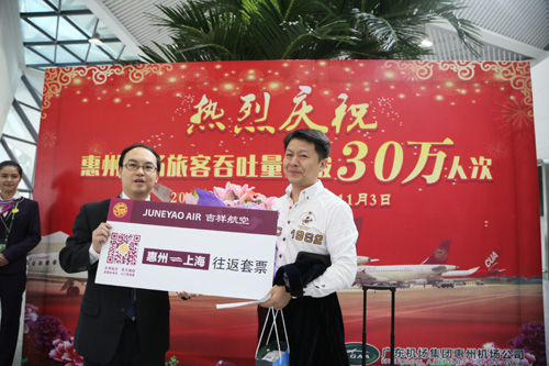 工作人员为惠州机场通航以来第30万名旅客送上机票.