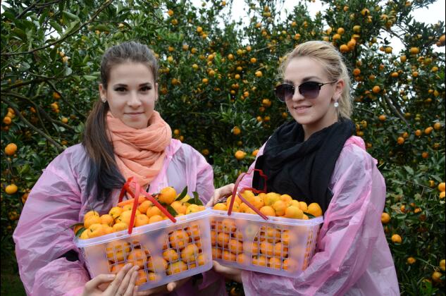 蜜橘丰收季,两位乌克兰姐妹花在橘园采橘留影.
