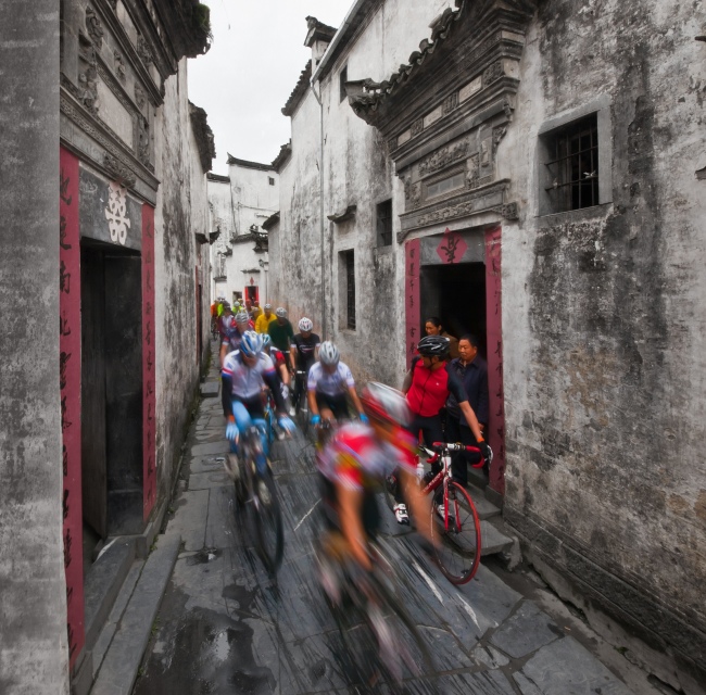 中國黃山(黟縣)國際山地車節選手在西遞騎行。汪炳奎攝