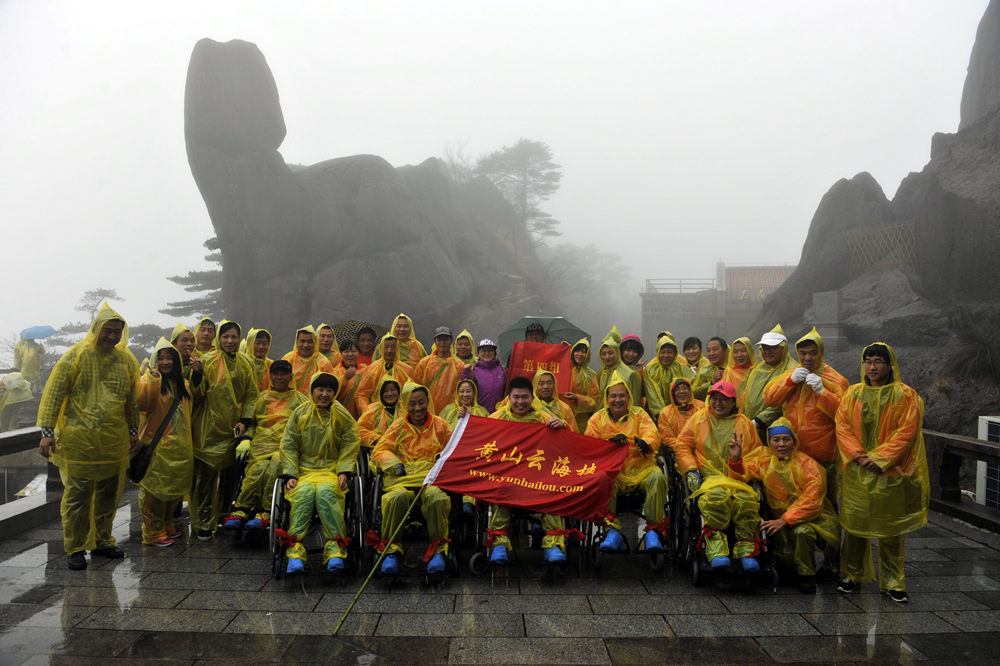 活動當天下著小雨,山上有霧,能見度不佳,程劍不停地招呼大家注意安全。他是活動的主辦人,也是黃山云海樓的樓主,作為一名胸椎癱患者,程劍曾經在床上躺了8年,一度對生活失去了信心,但當他第一次坐輪椅登上黃山,心里被震撼,重新燃起人生的希望,有了讓更多的輪友登上黃山的念頭。于是,從2006年開始,程劍幾乎每年都要舉辦一屆輪椅黃山行活動,活動得到了世界各地輪友們的積極響應和參與。今年雖然已經是第九屆,活動各個環節也都輕車熟路,但他依然親歷親為,一絲不茍。