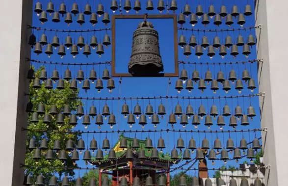 由1858个铜铃组成的“风铃墙”,微风吹过,叮铃作响