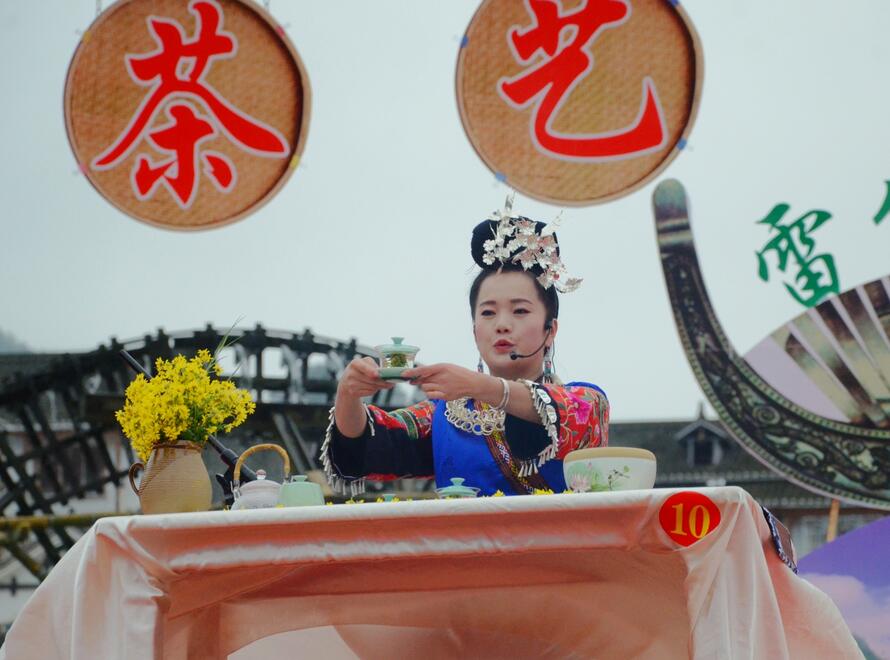 雷山銀球茶、苗春茶、腳堯茶、特級清明茶、云霧茶、雷公山茶……選手們在展示各種茶的沖泡技法的同時,配以專業的解說及視頻,帶給現場觀眾精彩的視聽享受。