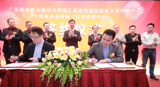 [香港商報網訊]11月28日,廣東新諾影業集團與邦盟匯駿集團在廣州簽約,將由邦盟集團輔導前往香港主板上市。同日,該集團與北京軍區相關部門簽約,將聯合出品國家重大革命題材大型電視連續劇《紅星照耀中國》。新諾影業集團董事長李軍、邦盟匯駿集團董事局主席盧華威等出席簽約儀式。