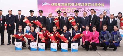 今天,成都双流国际机场年旅客吞吐量突破4000万人次是继2004年突破1000万人次、2009年突破2000万人次、2012年突破3000万人次以来实现的又一历史性跨越,成都正从国内众多二线城市中脱颖而出,跃入北、上、广一线枢纽城市行列,成为中国中西部的航空门户枢纽。这既是成都民航发展史上的一件盛事,也是成都国家级航空枢纽建设的新起点、新篇章。