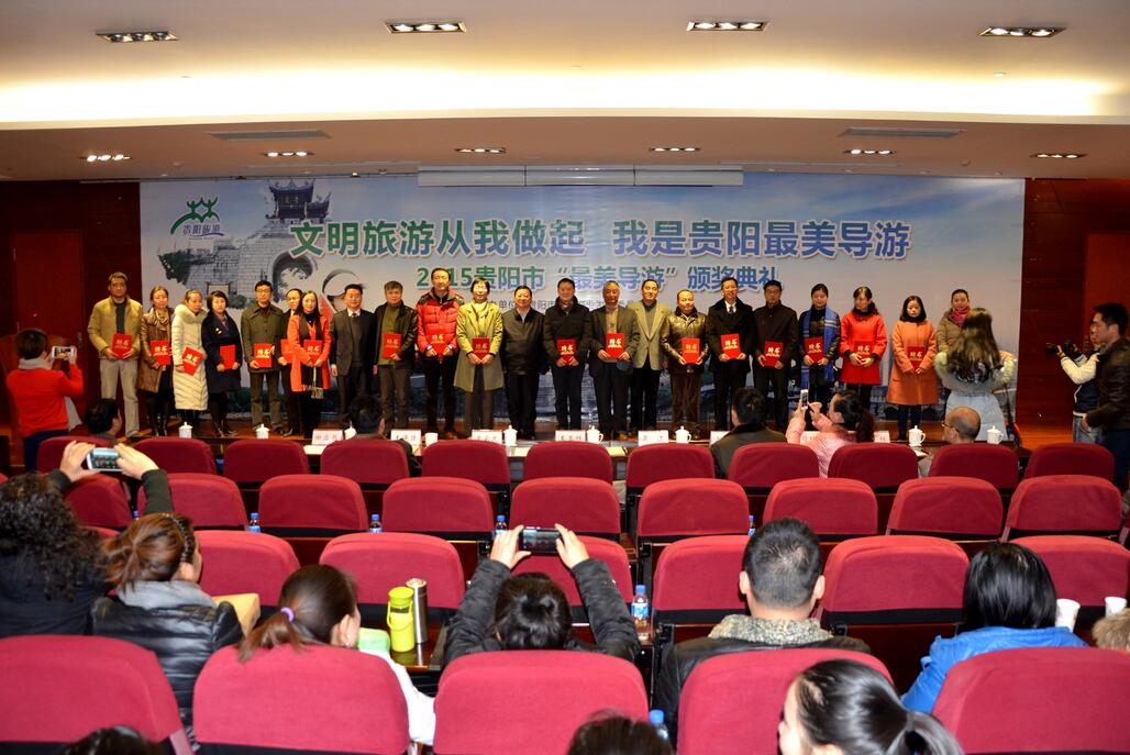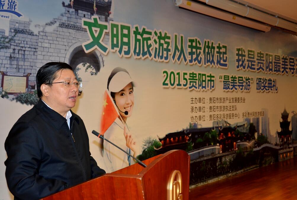 頒獎典禮上,貴陽市旅遊產業發展委員會主任袁雲龍說,今天參加頒獎典禮的100名導遊是我市2000多名導遊的優秀代表,長期以來,市導遊作為旅遊服務行業的從業人員,為貴陽市旅遊業的發展揮灑了辛勤的汗水,作出了重要的貢獻,旅遊業今天取得的成就離不開大家默默的奉獻。我們將通過此次活動向全社會展示導遊人員的形象和風采,樹立導遊標杆,並通過你們感染和提升其他導遊從業人員的行業自尊和行業自信。希望大家把在本次活動中學到的知識、收獲的感悟以及在比賽中表現出來的競爭精神帶到今後的學習、生活和工作中去。以更加飽滿的熱情、昂揚的鬥志和敢為人先的拼搏精神,投入到旅遊發展新常態中,為將貴陽建設成為宜居、宜業、宜遊的世界旅遊名城貢獻自己的一份力量。