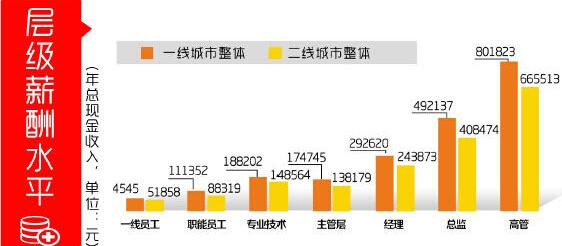 盡管二線城市和一線城市的高層間仍然存在將近20萬元的差距,但是各地企業的高層和一線員工的年收入差比倒是出奇地一致呢。報告顯示,無論一、二線城市,企業高層的年收入都是一線員工的12倍甚至更多。換言之,一線員工起早貪黑12載,不及高層幹一年。記者估算,一位成都的一線員工,一年不吃不喝大約可在成都三環地段購買6.4平方房產,而一位成都高層足夠購買一個83平米的小套二。