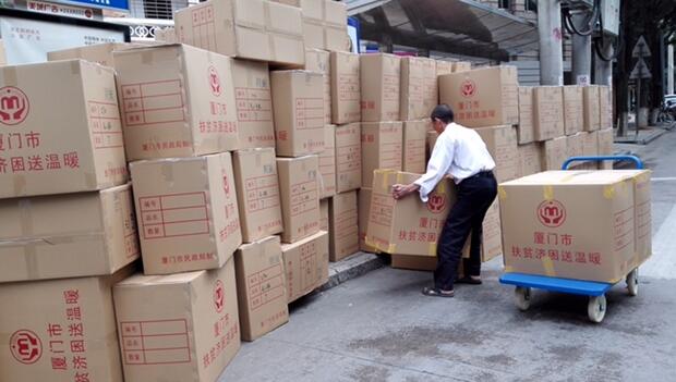 昨日上午,記者在同安慈善會辦公地址看到,裝衣被的箱子印有“扶貧濟困送溫暖”字樣,規格約為75cm*60cm*45cm,300箱把整個儲存室堆得滿滿當當。工作人員們快速有序地將經整理、消毒、檢驗檢疫,并包裝好的愛心衣被,從儲存室里一箱一箱搬到路邊,然后放到解放牌高欄車上。