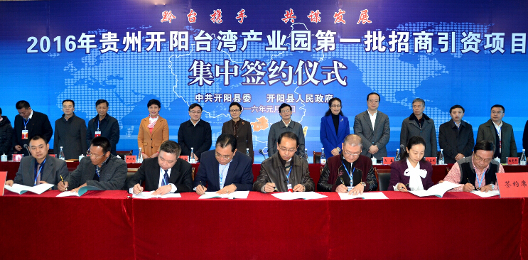 【香港商報網訊】記者 黃慶松 報道:1月8日,貴州省貴陽市開陽縣舉行的2016年貴州開陽臺灣產業園第一批招商引資項目集中簽約儀式上,該縣人民政府與20家臺資企業簽訂了招商代理協議、項目咨詢合作協議、項目投資協議,簽約總金額達55.3億元。