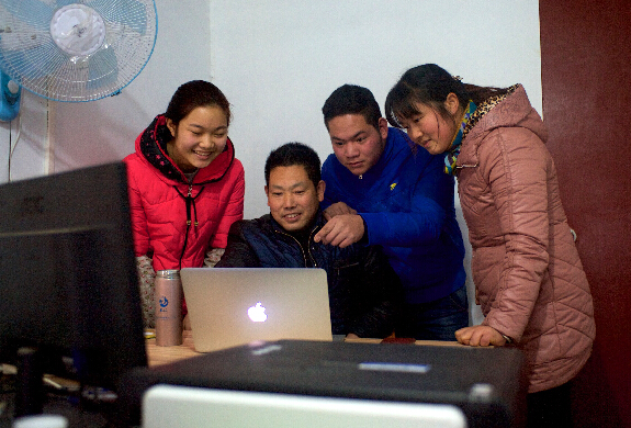 廖志軍(左二)和工人在網上查看耳機的銷售情況。