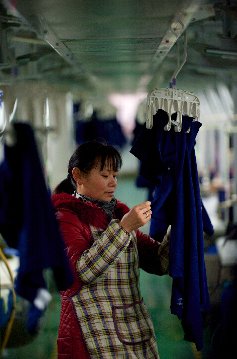 南昌市青山湖區一家服裝企業的員工利用智能懸吊系統檢查產品質量。