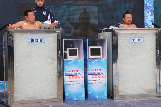17日上午,“中國第一冰人”陳可財和湖南湘西“火娃”向勇兩位耐寒奇人赤裸上身、僅著短褲,在裝滿真冰的“冰柜”里呆了近兩個半小時,為公益募集善款。兩人挑戰的同時,活動現場同步開通了芒果V基金捐助熱線和貧困腫瘤患者救助報名熱線,根據比賽規則,兩位挑戰者堅持的時間越長,就能讓更多的貧困腫瘤患者擁有申請救助的機會。