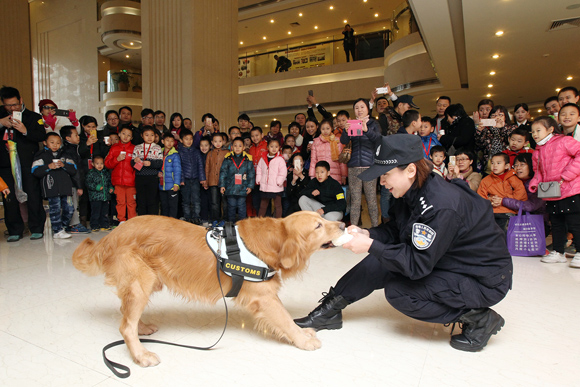 緝毒犬的現場搜毒表演是開放日活動最為“吸睛”的環節。表演的主角——金威,訓練有素。它憑著靈敏的嗅覺,迅速從眾多行李箱中找到了事先藏匿的毒品,現場響起了雷鳴般的掌聲。據悉,金威來自拱北海關緝私局緝毒犬隊,服役超過3年,有多次案件查獲記錄。它緝毒作業時身形矯健、目光銳利,與市民接觸時卻又乖巧溫順、萌態可掬,瞬間俘獲了不少粉絲。