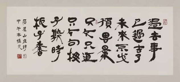 然而,原本書於簡或刻於石的碑簡字體,樵夫先生卻使用毛筆在宣紙上創作,介入了他自身的功力以及審美趣味。他巧妙地使碑簡古文字的特質在宣紙上得到完美呈現,凸顯手寫刀刻字體“平而不平,直而不直,似連非連,似斷非斷”的特征。同時,他也注意發揮毛筆和宣紙本身的特點,適當融入帖學書法技巧,於古拙中求新意。