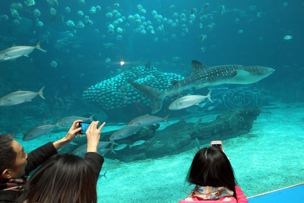 【香港商報網訊】記者陸紹龍報道:2月2日,長隆海洋王國鯨鯊館,新添三頭鯨鯊“小將”正式與遊客見面。由此,生活在長隆海洋王國的世界最大的鯨鯊展示種群得到了一次根本性的壯大——由五頭增加到八頭。2016年春節期間,來到長隆海洋王國度假的遊客將有機會獲得“八鯊迎春”的好意頭。在當天,長隆海洋王國還請到“財神”到達“世界第一水族箱”的海底,為遊客和鯨鯊們送上祝福。