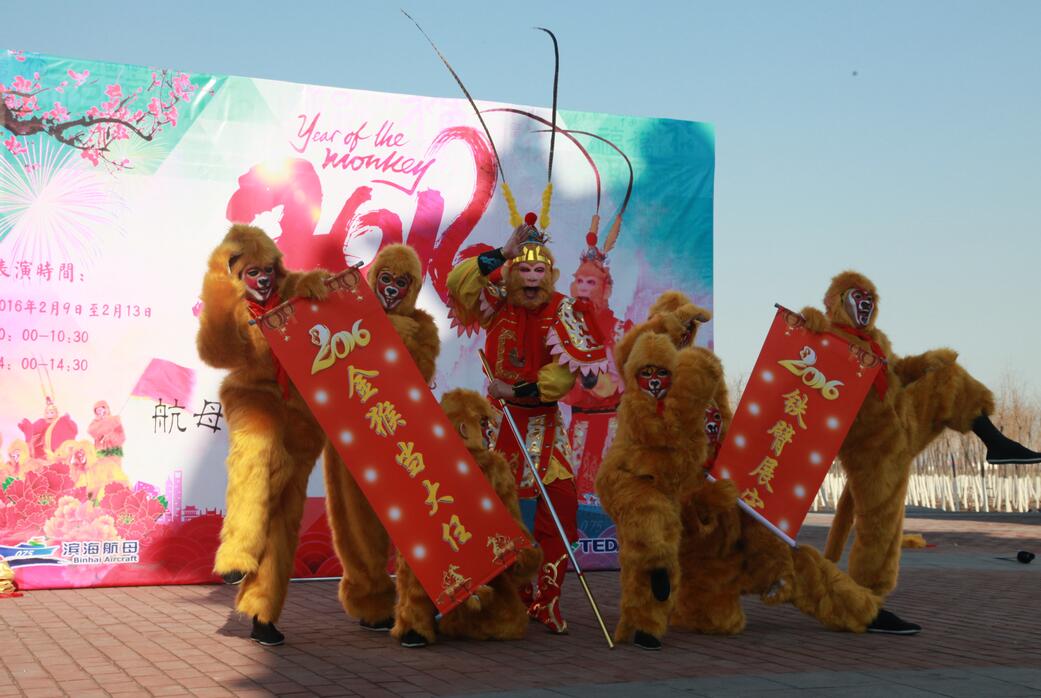 [香港商報網訊]記者邢寶華報道:群羊辭舊歲,金猴迎春到。猴年春節期間,天津濱海航母主題公園喜氣洋洋年味濃:備受矚目的猴王獻瑞贏得了滿堂彩,從天而降的“洋財神”忙著派財送福,驚豔絕倫的俄羅斯歌舞讓遊客大飽眼福,“雪域王國”免費戲雪人聲鼎沸……中西合璧、獨具特色的航母歡樂年,吸引了不少遊客的關注,繼元旦後,濱海航母迎來2016年又一個客流小高峰。
