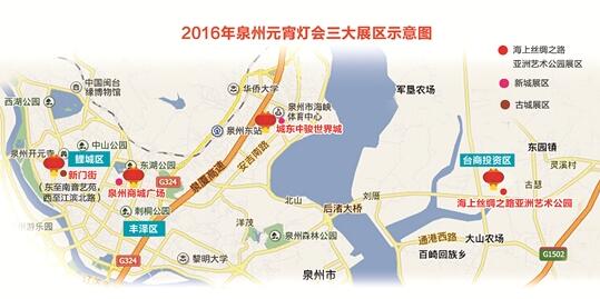 2016年元宵燈會以“創新泉州、智造泉州、海絲泉州、美麗泉州、幸福泉州”為主題,共分為三個展區,分別是古城展區、新城展區及亞藝園展區。