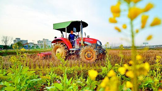 湖北日報訊 18日,早春咸寧油菜花初綻的田野里,咸安區向陽湖鎮寶塔村農機大戶胡志亮駕駛大型旋耕機在田間進行春耕作業。此前,為了迎戰春耕大生產,該區12家農機合作社對1000多臺耕作機械完成檢測檢修。目前,部分農機已投入早春作業。 (記者劉曙松 視界網吳濤 攝)