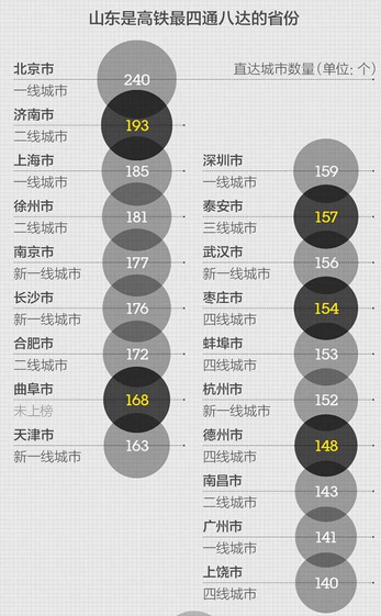 近期,有媒體根據國內一家資訊平臺的大數據分析結果報道稱,武漢能高鐵直達的城市為156個(包括直轄市、省會城市、地級市、市轄區之外的縣級城市),在全國城市中排名第十三;濟南能高鐵直達的城市為193個,在全國城市中排名第二,其中,濟南能高鐵直達的直轄市和省會城市為19個。