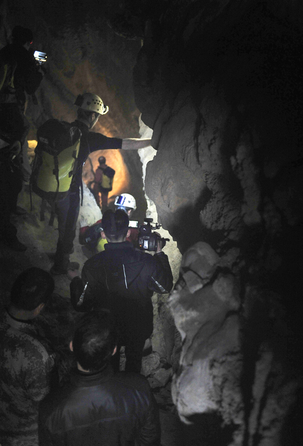 科考探险队员们在韦虎臣军事地下隧道内考察(韦禄东 摄)