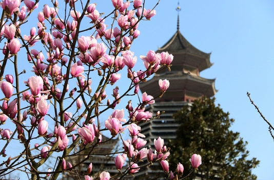 2016年3月1日,市民在貴州黔東南黎平縣城中文化廣場與盛開的白玉蘭合影