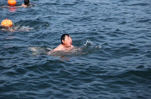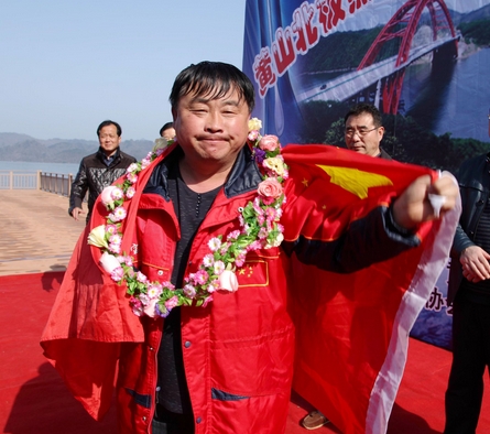 【香港商報網訊】記者吳敏 通訊員崔豔報道:2月27號,“黃山北極熊”——崔德益和他的教練王剛義在太平湖風景區與冬泳愛好者們一起參加挑戰南極冰海啟動儀式。啟動儀式上,崔德益和他的教練王剛義一同展示了曾經在北極挑戰冬泳世界紀錄成功時插在北極的一面國旗,崔德益身披國旗,信心滿滿地說,這次挑戰南極成功後,他將把這面國旗再次插在南極上,為國人爭光。當地的數十位冬泳愛好者們,現場與崔德益一起冬遊太平湖,為他助興加油。