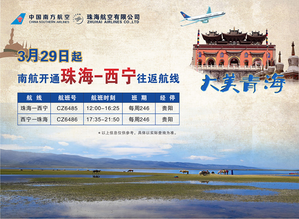 據了解,該航線目前屬珠海乃至珠江口西岸地區唯一通往青藏高原的航線,航班全程四個半小時,中途經停貴陽,珠海起飛時刻為12:00,到達西寧時刻為16:35,西寧起飛時刻為17:25,到達珠海時刻為21:50。珠海—西寧航班已進入南航銷售系統,不少旅客已通過南航官網和售票處提前訂座。開航初期,南航將推出低至2.5折的超值優惠機票。目前,該公司正與珠海和澳門等地的旅行社洽談團隊遊、自由行等合作事宜,通過推出“大美青海”、“西北深度遊”等不同特色的旅遊配套產品,讓珠澳及周邊城市市民盡享西北地區的獨特魅力。