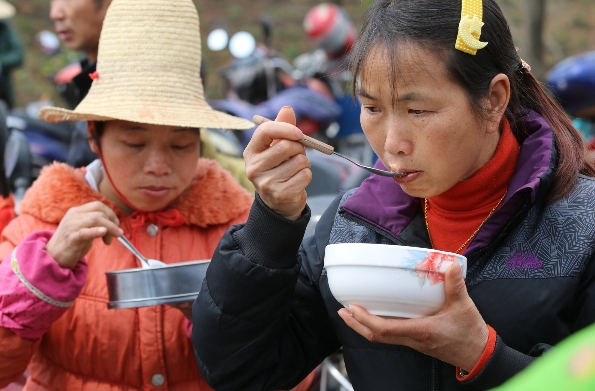 【香港商報網訊】2016年3月27日,在江西遂川縣雩田鎮狗牯腦黃金茶產業基地裏,請來的采茶工忙完上午采采摘鮮葉後,中午紛紛返回基地吃起老板提供的免費吃飯,午餐並不豐盛,無外乎就是一些蔬菜,加點肉。但在午餐時間裏,采茶工難得的休息時間,一邊自由站著、坐著吃飯,一邊開玩笑,嘮家常,不時還能聽見采茶工發出爽朗的笑聲,他們忘卻了采茶的辛苦。