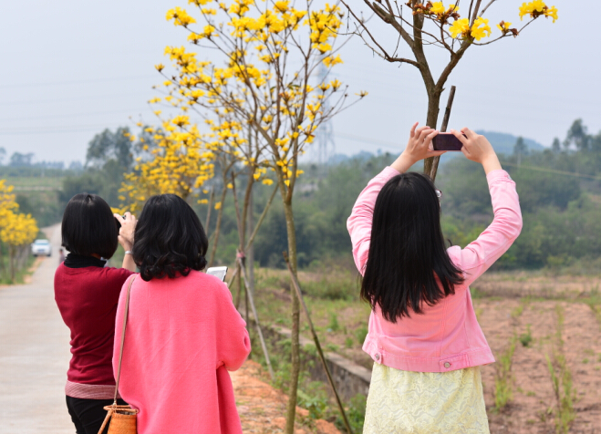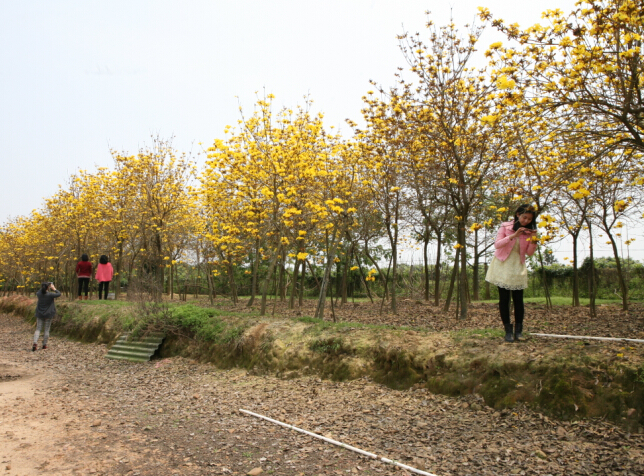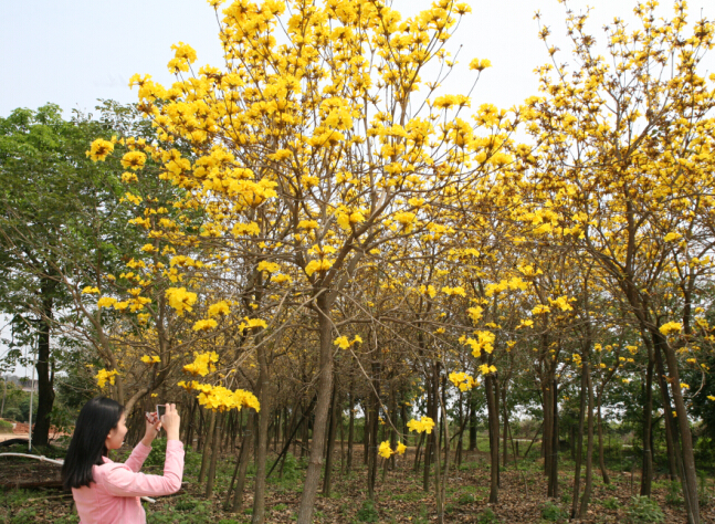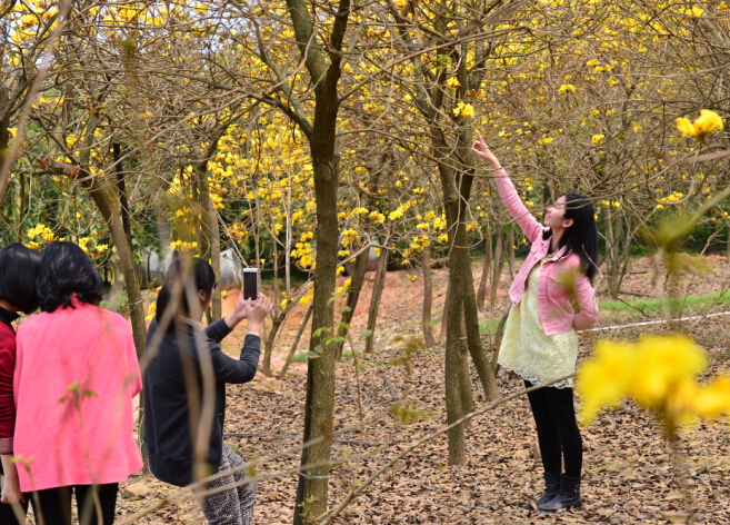 集中種植的黃花風鈴林,儼然一片黃色的花海,引得遊人紛紛拍照留念。