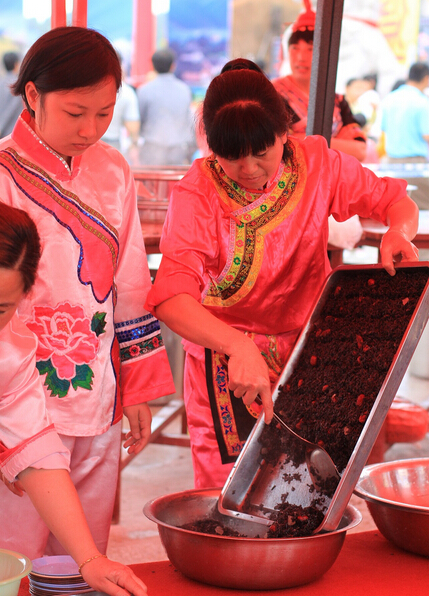 每逢三月三來臨,畬族鄉民會將精心挑選出鮮南燭葉搗碎,加入適量的水榨成汁,再把糯米泡在烏樹汁中20個小時,將其染為黑色。最后在糯米中加入紅棗、桂圓、腰果或咸肉、香菇、豌豆等蒸熟,分別制作出甜味和咸味的烏米飯。