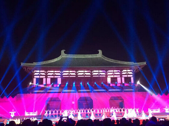 開幕式后,一臺以定鼎門整體建筑為背景,結合燈光投影表演的大型情景歌舞劇《花開中國·跨越絲路》精彩上演。該劇是洛陽近年來首次在開放式室外場地舉辦的一場接地氣的大型實景演出,長約一個小時,分為河洛之韻牡丹之歌、絲路傳奇文明之光、神都盛世天樞迎賓、花開中國世界綻放四個篇章,以歌舞演繹出絲路繁榮、天樞迎賓、各國來使、萬花來儀的古都洛陽千年文明盛世。