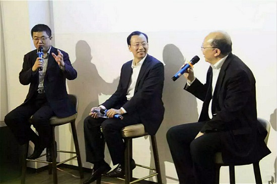 李鳳亮校長(中)、德思勤董事長龍固新先生(左)與北大校友會副秘書長赫然先生現場對話