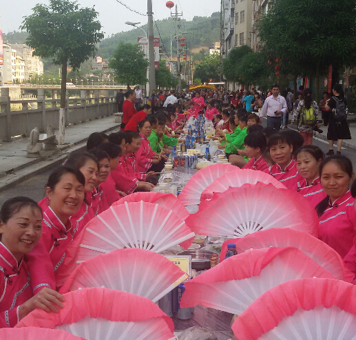 當日下午5時,樂里河畔擺滿了宴席,敬酒歌此起彼伏,熱鬧非凡。五色糯米飯、臘肉、八渡筍、云耳等特色食物攤在芭蕉葉上擺上宴桌,當地群眾正以特有的淳樸方式喜迎八方來客。樂里鎮三個社區的長壽老人齊聚一堂,共享長壽宴,壯家兒女為老人們唱起祝壽歌,場面其樂融融。“百家宴”又稱“長桌宴”,也叫“合攏飯”,亦稱“打平伙”,是獨特又古老的民俗文化。