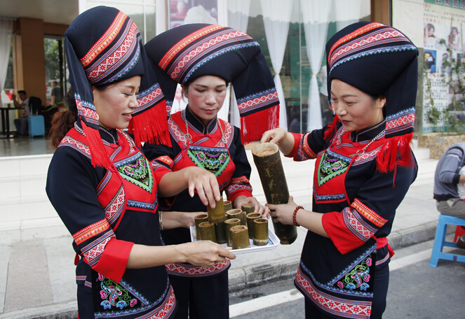 當地群眾在百家宴上身穿盛裝給客人敬酒
