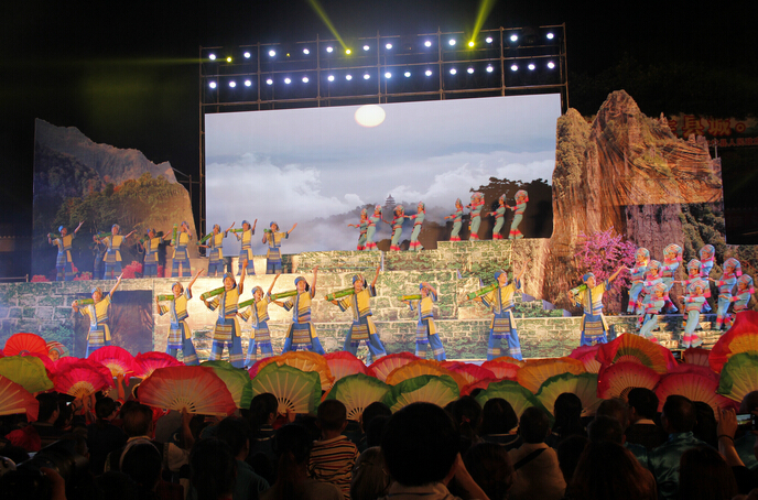 【香港商報網訊】記者馨瑤、實習記者李勤虹報道:25日,2016年“吼敢”壯劇節在廣西百色市田林縣拉開帷幕。一年一度的壯民族盛會活動精彩紛呈, 360桌宴席喜迎八方來客,大型壯族風情歌舞《歐貝》綻放“吼敢”壯劇光彩。