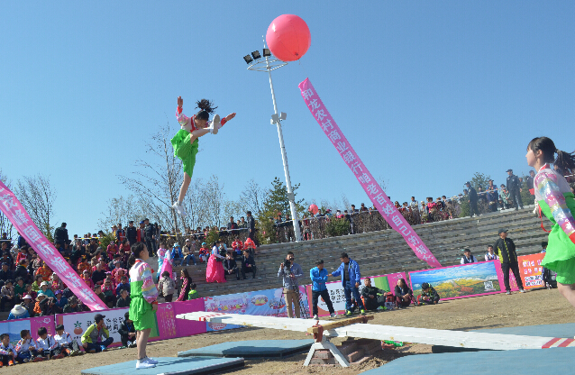 中國·和龍第八屆長白山金達萊國際文化旅游節開幕當天,朝鮮族傳統跳板表演。