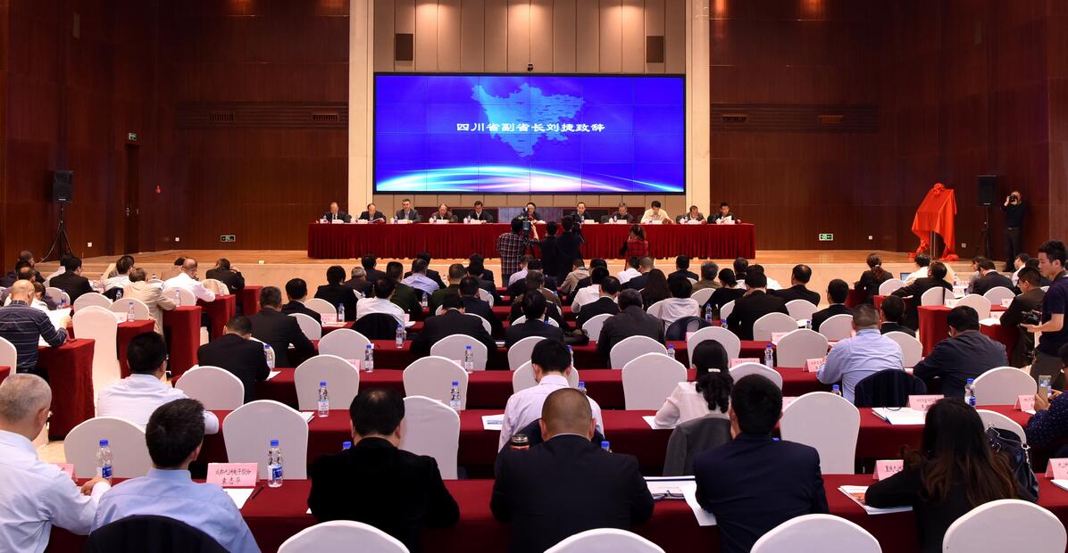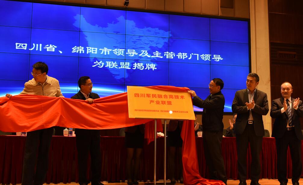 會后,四川省人民政府副省長劉捷、中共綿陽市委書記彭宇行、九洲集團董事長杜力平和聯盟單位領導為四川軍民融合高技術產業聯盟成立揭牌。