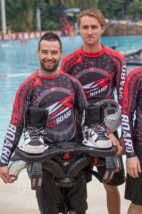 Flyboard直譯為飛板,因為這項運動的表演者需要在水的上空進行表演,外界多喜歡以更為形象的“水上飛人”來稱呼他們。據史蒂芬介紹,水上飛人表演是由法國人扎巴塔在2011年發明的。據史蒂芬介紹,每年都會有水上飛人表演的世界杯,這項賽事的發起者也是扎巴塔本人,這項賽事的頂尖選手大都被招到了FS旗下。目前,FS隊伍中有超過40余位隊員,有意思的是,這些隊員幾乎都來自不同的國家,國籍總數超過了40個,目前,他們已經在全世界的30余個國家進行過表演。