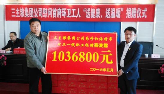 當日上午,呼市總工會、呼市環衛局攜手三主糧集團公司、內蒙古愛心之家公益協會、呼和浩特志願者聯合會等,舉行了主題為“送健康、送溫暖”的公益活動,將價值1036800元的“三主糧”燕麥露分送到環衛工人手裏,每位環衛工人一件。今年63歲的賽罕區環衛工人郝秀秀激動地說:“社會各界關愛環衛工人,喝上飲料,我們是爽在身上,暖在心裏。”