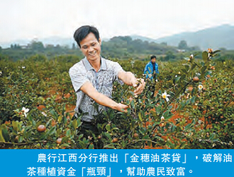 產業扶貧是解開貧困枷鎖的金鑰匙,也是金融扶貧的重要手段。為加大對貧困地區、貧困農戶發展產業的信貸投入,農行江西分行在金融創新上狠下功夫,推出「金穗油茶貸」,破解油茶種植資金「瓶頸」,并創設農戶貸款「產品箱」,全面對接產業扶貧,有效破解農村、農民貸款難和擔保難題。