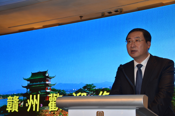 赣州市政府市长冷新生介绍赣州市情及优惠政策,并与客商代表互动交流。