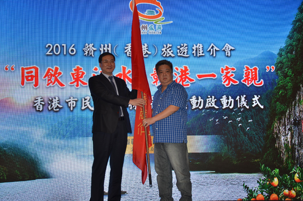 赣州市政府市长冷新生向美味假期旅行社授旗,启动港人赣州探源行。