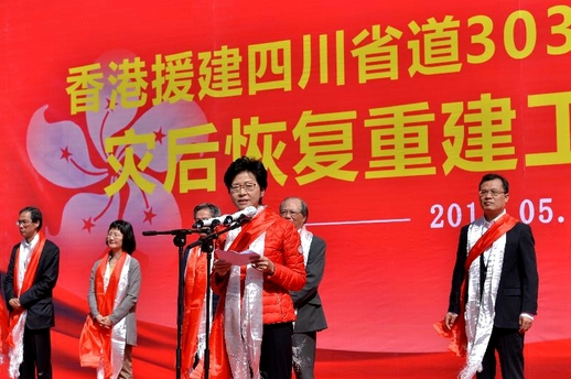 當天上午,林鄭月娥一行前往汶川縣映秀鎮主持特區援建的公路項目“省道303”(映秀至臥龍段)的貫通儀式。省道303(映秀至臥龍段)是通往臥龍自然保護區的生命線,也是前往四川西北及西藏的重要道路。在汶川特大地震中,省道303遭受極嚴重破壞。特區援建的路段起於映秀鎮,經耿達鎮止於臥龍鎮,全長44.5公裏。建設內容包括新建隧道六條、大橋六座及棚洞十四座。援建工程在2010年和2011年間,期間多次遭到特大山洪泥石流極嚴重損毀,需調整設計後再恢複重建。項目援建金額為二十億三千四百三十萬港元,預計在2016年底全面竣工和通車。